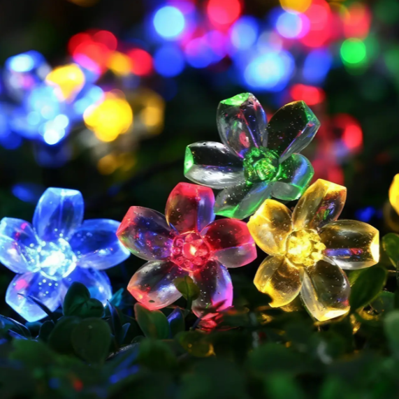 Світильник виконаний у вигляді гілочки з квітами, які світяться різнокольоровими LED-вогниками, створюючи ефект живого цвітіння у темряві. Вбудована сонячна панель заряджається вдень від сонця, а ввечері автоматично вмикає підсвітку.